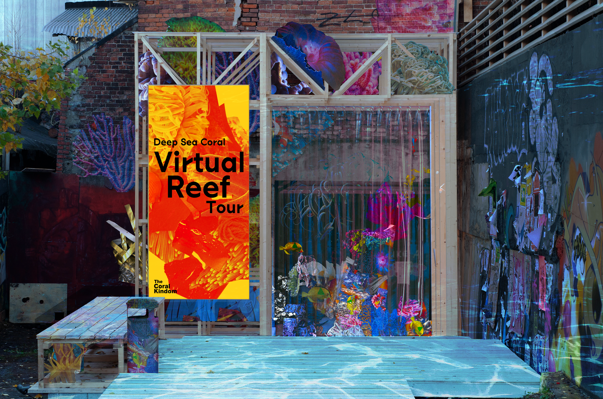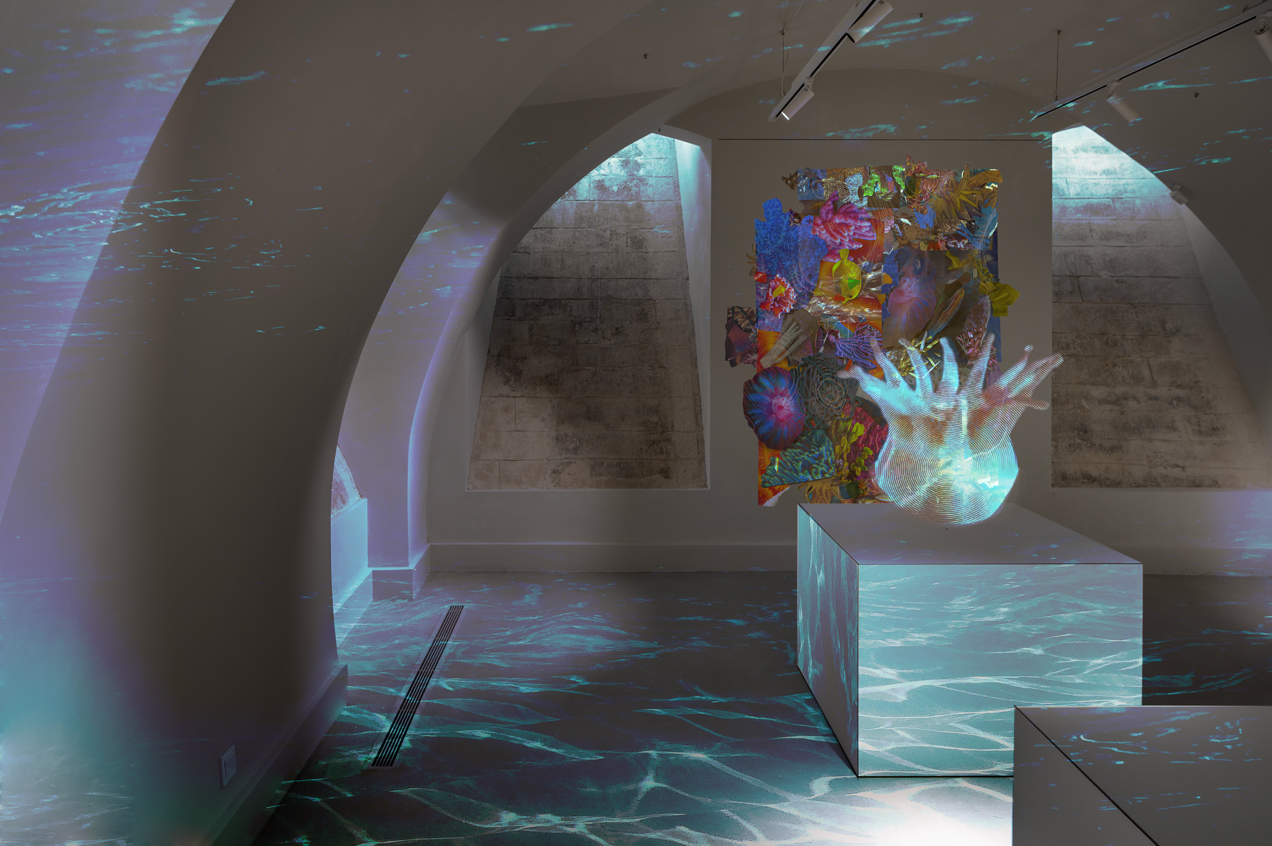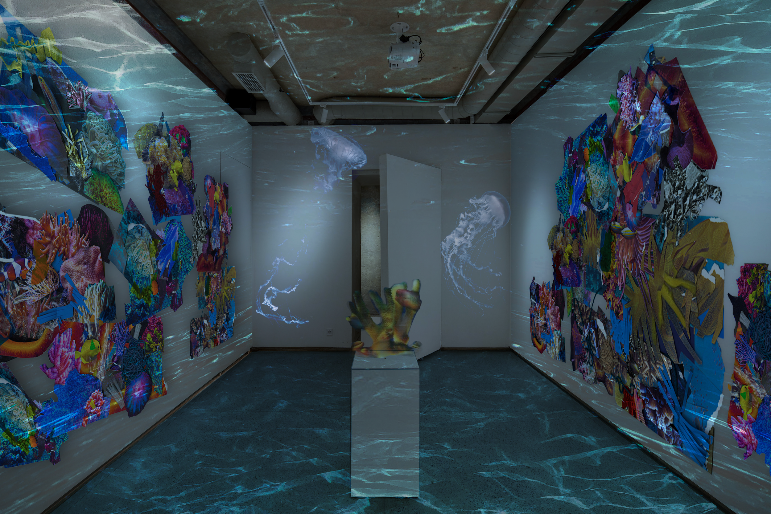 There will be partial projections of the collage installation on the wall inside the exhibition hall, while some holographic projections of individual corals are placed in the center of the room, where visitors can observe the corals up close.